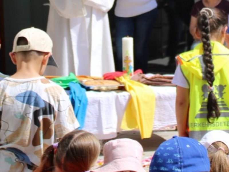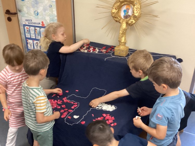 Am Donnerstag, den 19. Juni, wurde in userer Kita das Fronleichnamsfest in einer Andacht gefeiert. Schon im Vorfeld war Brot zum gemeinsamen Teilen gebacken und Blumenbilder gestaltet worden. Die Krippenkinder feierten mit den jüngeren Kindergartenkindern auf dem Außengelände. Die Vorschulkinder machten sich auf den Weg in die Mühlenaue, wo sie gemeinsam mit Pfarrer Körner und Kindern aus anderen Einrichtungen das Fest feierten. Es wurde gesungen, gebetet, Brot geteilt und die Monstranz bewundert. Vor dem Heimweg gab es Pizza zur Stärkung und die Möglichkeit, das Außengelände zu erkunden.