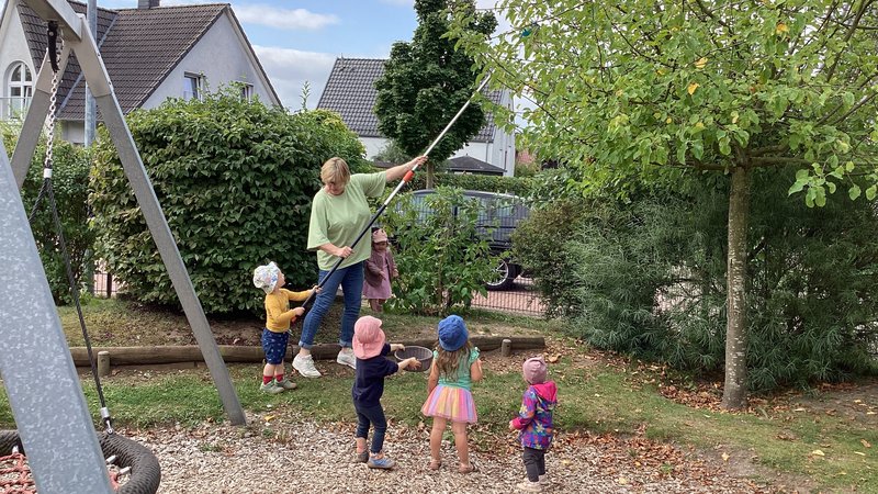Bei uns in der Regenbogengruppe drehte sich die letzten Wochen alles rund um den Apfel. Wir haben passende Fingerspiele und Lieder im Kreis gespielt, den Apfel genauer angeschaut und Äpfel mit Fingermalfarbe gebastelt. Außerdem haben wir in unserer Kita viele Äpfel geerntet und daraus leckeren Kuchen gebacken und Apfelmus gekocht. In unserem Flur stand ein Erzählbaum, der uns Vieles von der Streuobstwiese erzählt hat. Diesen Baum durften wir uns zwei Wochen vom Verein der Streuobstwiesen Wunstorf ausleihen und nutzen — das hat allen Kindern viel Freude bereitet.